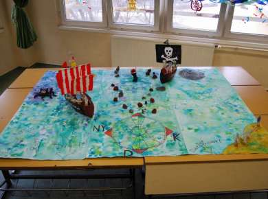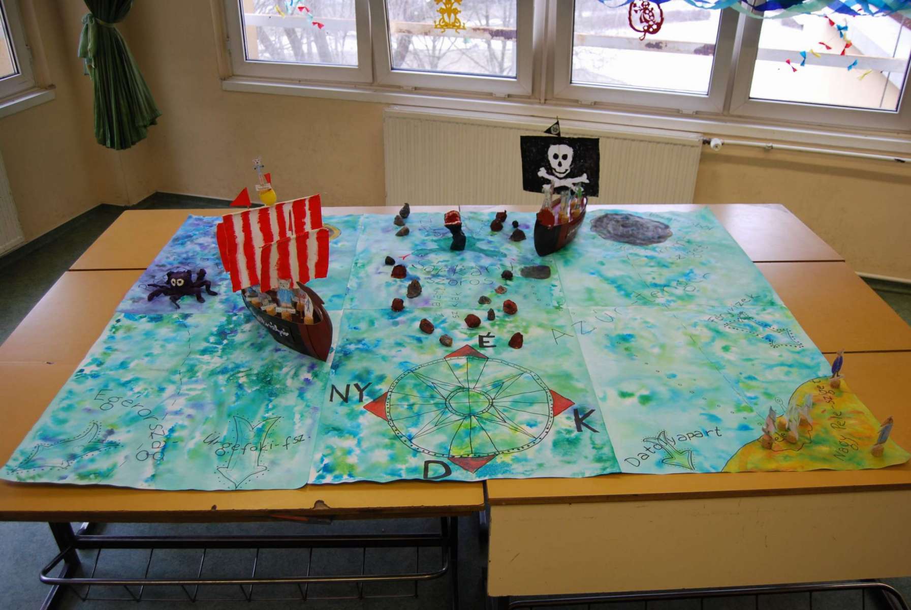 A térképet vizes papírra festettük jó minőségű anilin festékkel. A gyerekek nagyon élvezték a színek futását és keveredését a vizes alapon. Igyekeztünk élethűen visszaadni a Ragacs-tenger lilás-feketés árnyalatait, és az Azúr-tenger kékségét. Száradás után megfestettük a szigeteket, majd fekete filccel ráírtuk a könyvben szereplő megnevezéseket. Szinte egymás kezéből kapkodták a gyerekek tollat, mindenki rajta akarta hagyni a kéznyomát a térképen.